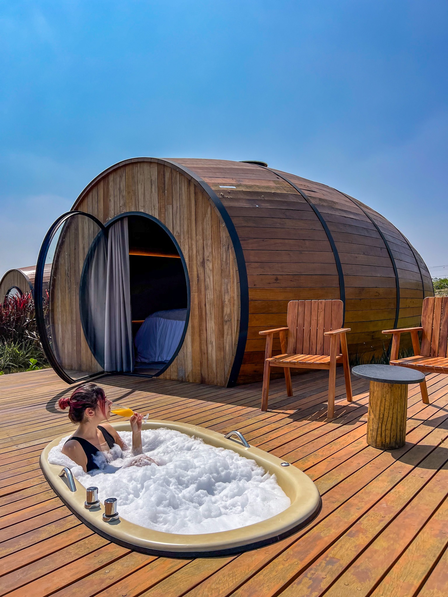Já pensou em dormir dentro de um barril de vinho gigante no alto da Cuesta de Pardinho? A Villa Dejota transformou tonéis de madeira em microcasas de luxo, as chamadas Tiny Wine Houses. Elas ficam espalhadas dentro do próprio vinhedo, o que garante uma integração total com a paisagem, uma atmosfera muito encantadora e um céu super estrelado.