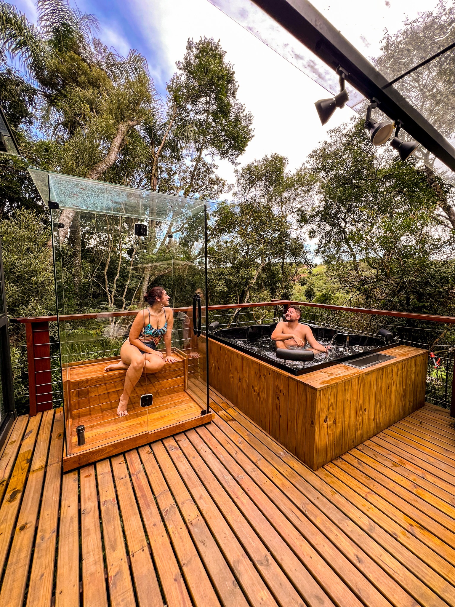 O que a gente mais amou foi a estrutura externa no deck de madeira. Tem sauna úmida transparente, jacuzzi aquecida e até um gazebo com redário para descansar. É o equilíbrio perfeito entre o rústico da natureza e o luxo da tecnologia, com direito a lago privativo e até carregador para carro elétrico. É uma experiência futurista e muito confortável.