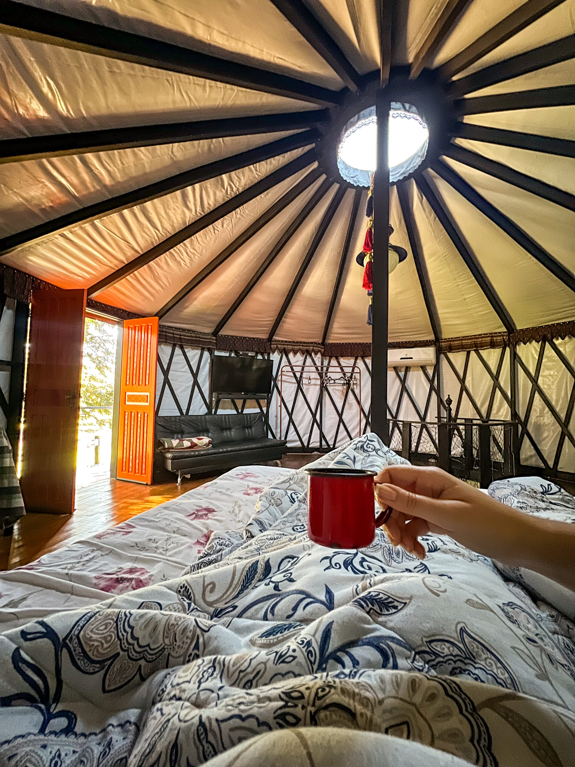 Se vocês buscam algo realmente fora do comum, precisam conhecer as Yurts. Elas são inspiradas nas habitações tradicionais dos antigos povos nômades da Mongólia, mas com um toque de luxo e muito conforto. O formato circular da cabana e os detalhes da estrutura criam uma atmosfera temática que a gente raramente encontra por aqui.