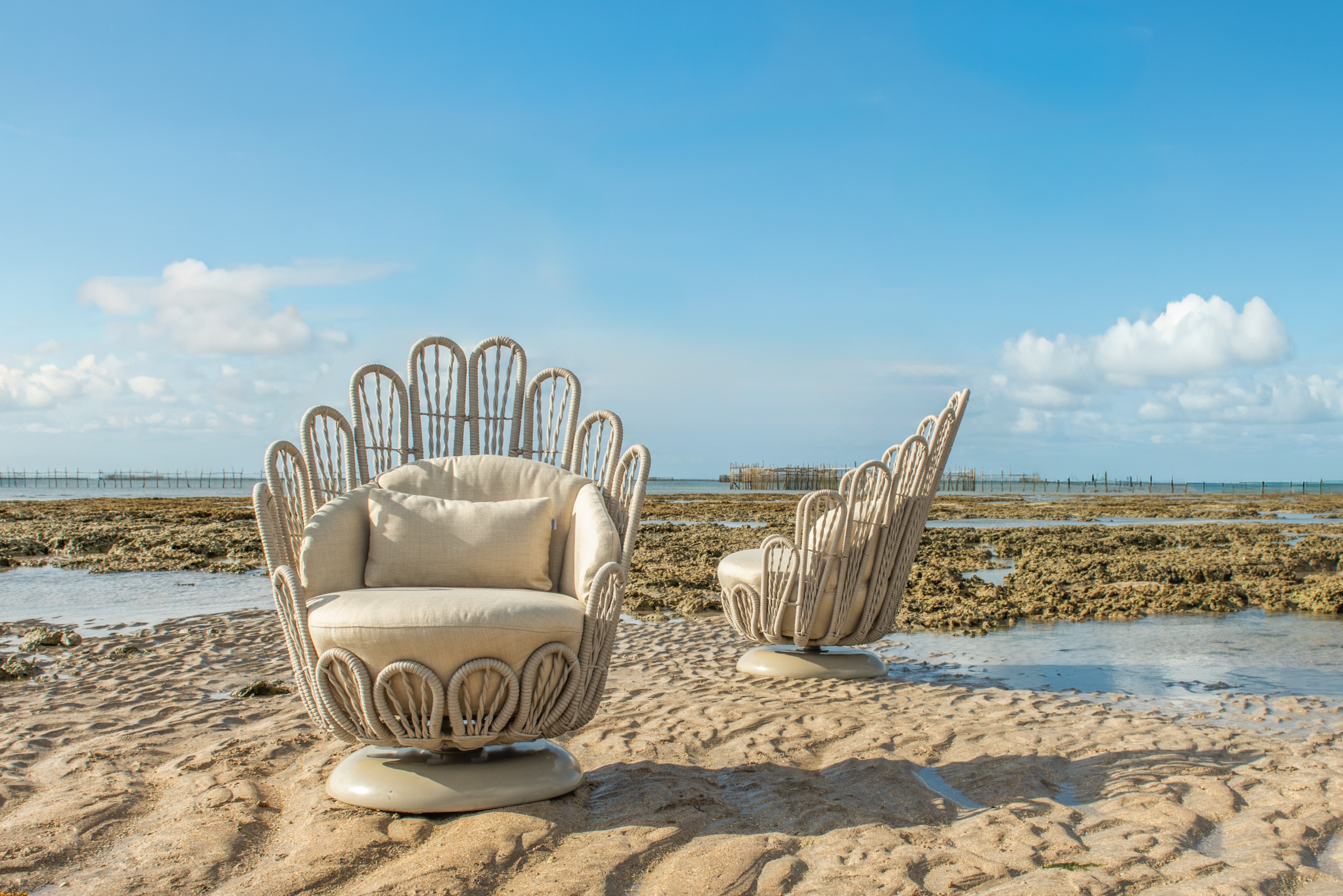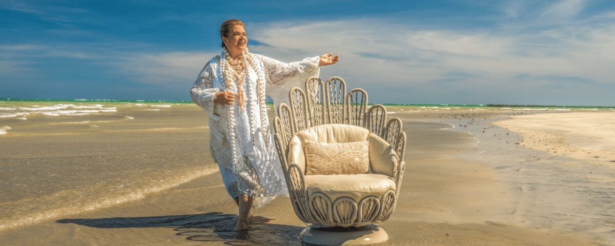 A proposta traduz paisagens e sensações do Nordeste brasileiro em design. Formas orgânicas, tramas delicadas e texturas que remetem ao mar e às conchas aparecem em peças que unem conforto e poesia estética. O grande destaque é a poltrona Pérola, criada em formato de concha e pensada como símbolo de acolhimento e delicadeza. A peça transporta para o universo do mobiliário outdoor o olhar sensível que consagrou Martha Medeiros na moda. “Dentro das mais raras conchas nasce a pérola, e ela é você”, define a designer, reforçando o caráter emocional presente na criação.