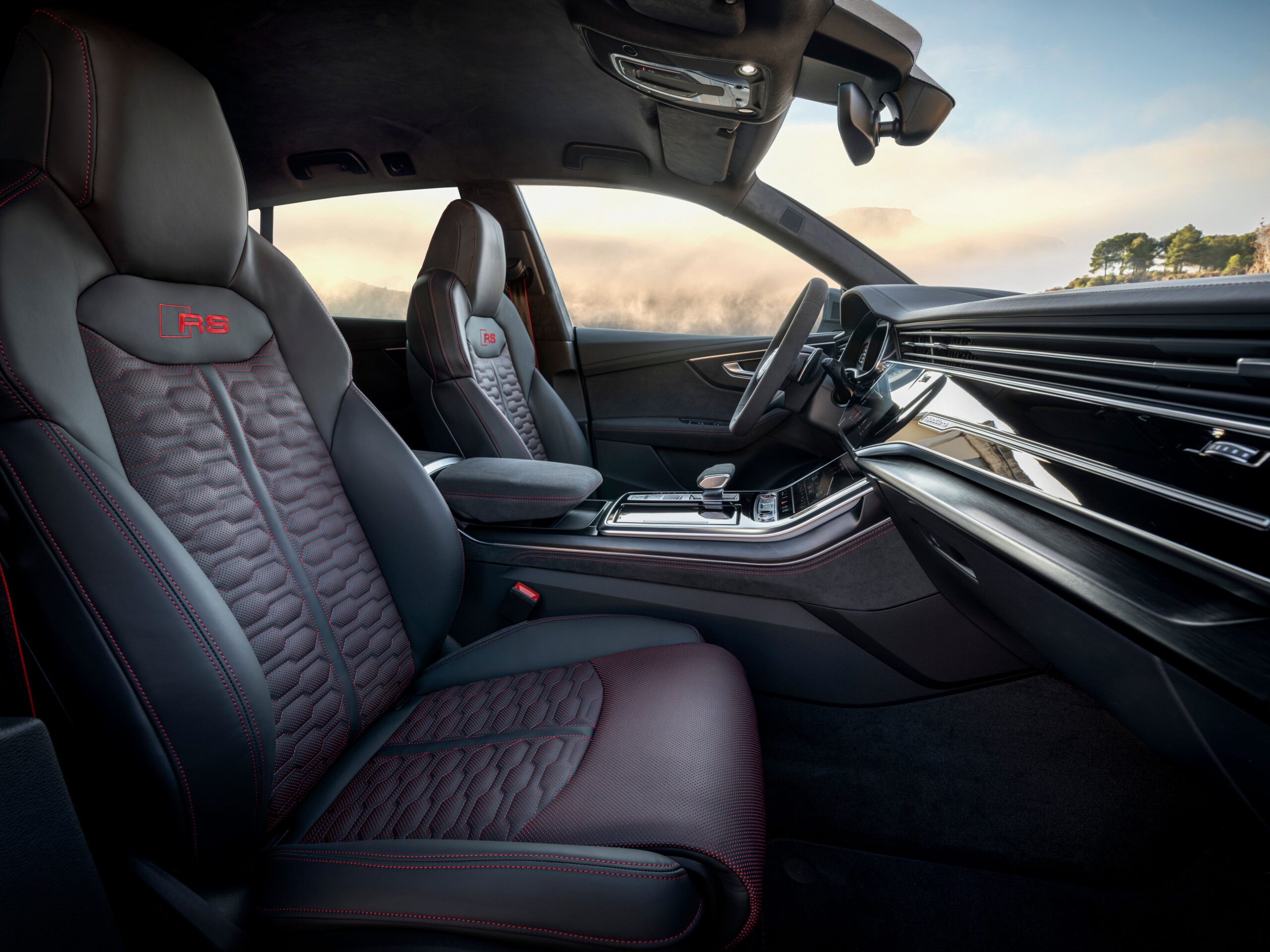 A lista de equipamentos inclui tecnologias de assistência à condução como controle de cruzeiro adaptativo, lane keeping assist com emergency assist, assistentes de troca de faixa e tráfego traseiro, exit warning, Audi Pre Sense dianteiro e traseiro, câmera 360°, faróis Full LED Matrix com apresentação de luzes e lanternas traseiras em OLED, além de park assist plus com sensores dianteiros e traseiros. Entre os itens de conforto, o modelo oferece ar-condicionado automático de quatro zonas, Audi Drive Select, Auto Hold, bancos com ajustes elétricos, memória, aquecimento e ventilação, espelho interno antiofuscante, portas com fechamento servo assistido, head-up display, keyless entry, iluminação interna customizável com 30 cores, porta-malas elétrico com abertura hands-free, apoio lombar elétrico e teto solar panorâmico Open Sky. No sistema de infoentretenimento, o SUV conta com som Bang & Olufsen 3D de 730 W, MMI Navegação Plus com MMI touch response e Audi Virtual Cockpit Plus com layouts específicos dos modelos RS.