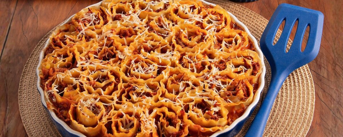 A clássica carne de panela ganha uma nova leitura nesta lasanha invertida que aposta no conforto e no sabor. Preparada na pressão com legumes e passata de tomate, a carne – que fica extremamente macia – é desfiada e se transforma no recheio principal do prato.