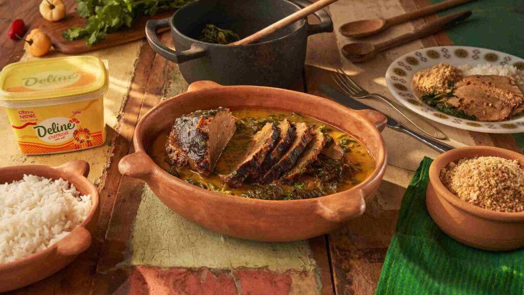 Modo de preparo: faça uma pastinha com o cominho, o açúcar, o alho picado, a Deline Milho, o sal e a pimenta-do-reino. Espalhe a pastinha por toda a peça do lagarto, esfregando bem a carne, para que pegue o tempero. Reserve a carne em uma tigela coberta com filme plástico na geladeira de um dia para o outro. Para fazer o caldo, aqueça uma panela de pressão grande em fogo alto. Quando a panela estiver bem quente, coloque a Deline Milho e sele a carne até dourar, de todos os lados. Acrescente a cebola picada, o alho e o louro, mexendo por alguns minutos para refogar. Coloque o tucupi, acrescente a chicória-do-pará e a pimenta-de-cheiro e feche a panela de pressão. Assim que pegar pressão, abaixe o fogo e cozinhe por cerca de 40 a 50 minutos. Enquanto a carne cozinha, leve outra panela com água ao fogo e cozinhe rapidamente o jambu. Escorra a água e reserve. Assim que a carne estiver cozida e a pressão já tiver saído da panela, retire o lagarto da panela e fatie. Coloque a carne em uma panela mais baixa ou em uma travessa alta com o caldo de tucupi quente e o jambu. Ajuste o sal e finalize com pimenta-de-cheiro e coentro picado. Sirva com arroz branco e farofa para acompanhar.