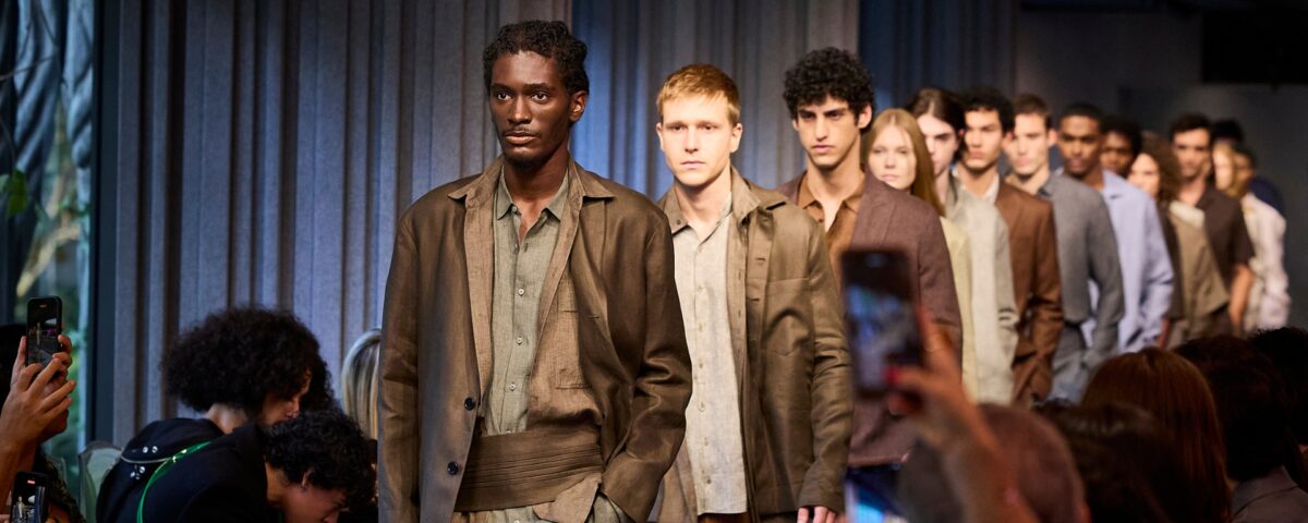 Tecidos como lã, algodão e linho surgiram em propostas com camisas, paletós, gravatas, calças e overcoats de caimento leve. A cartela de cores percorreu tons terrosos, areia, azuis e cinzas.