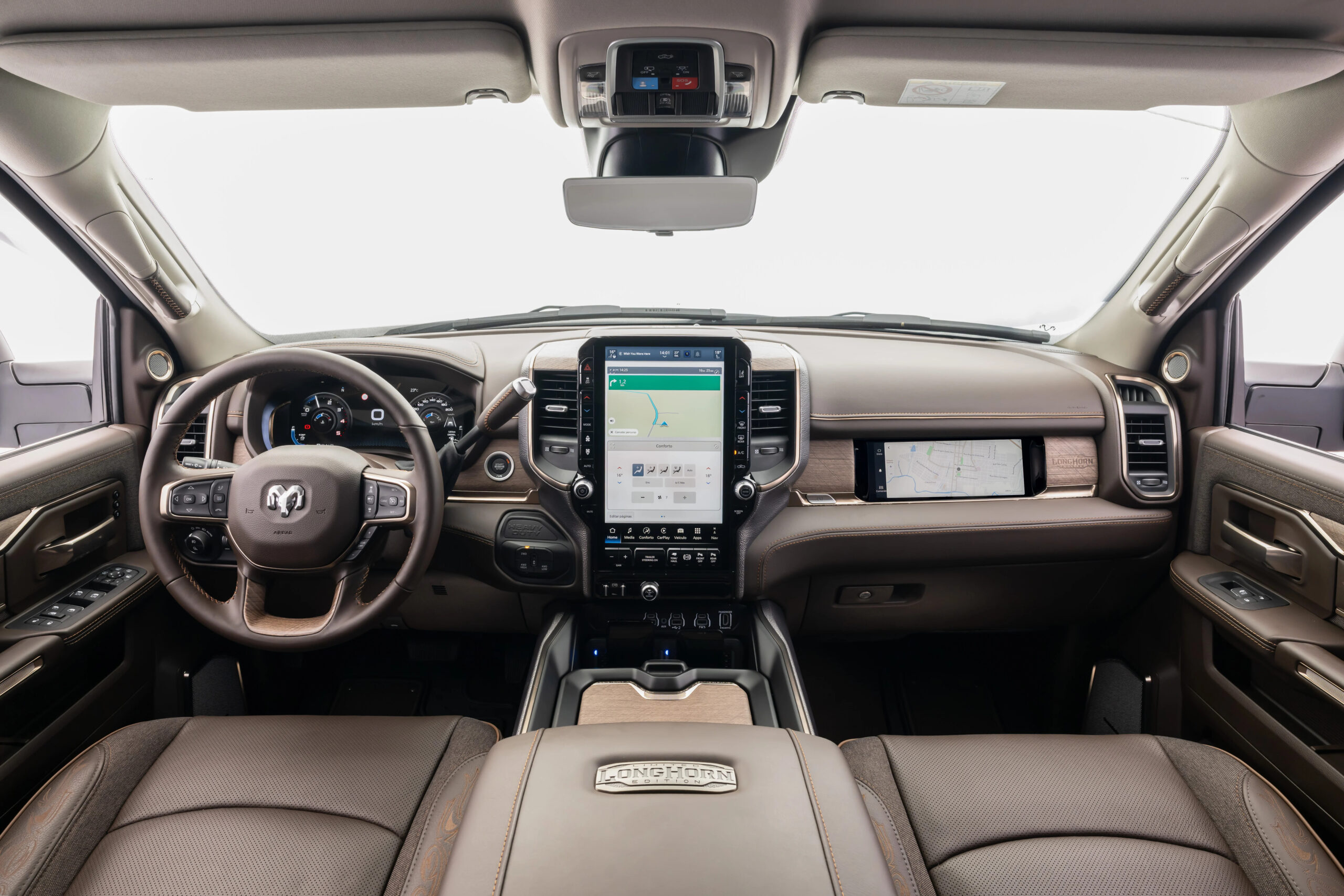 No interior, os modelos seguem apostando em conforto e acabamento premium. A versão 3500 Limited Longhorn representa o topo da gama da marca no país, com cabine revestida em couro, detalhes em madeira legítima e elementos decorativos exclusivos. Entre os recursos tecnológicos, o retrovisor digital 3.0 amplia a visibilidade do motorista ao projetar diferentes ângulos de visão, especialmente útil durante o reboque de trailers ou implementos.