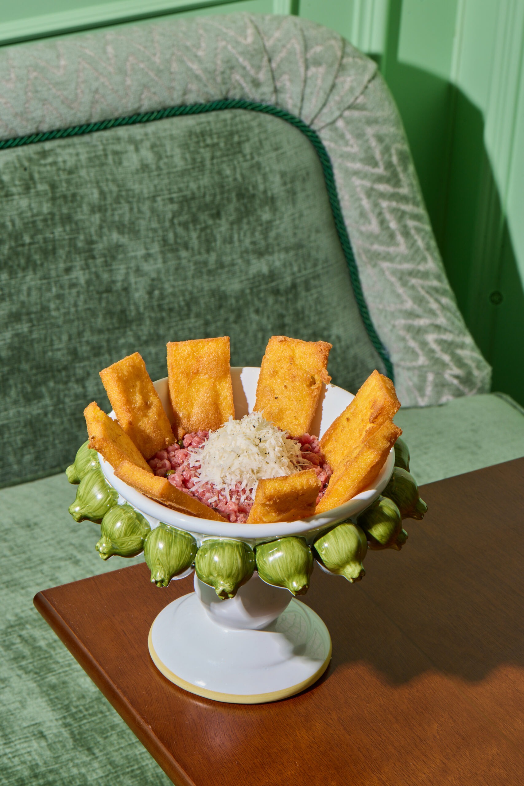 Com ares de residência de campo italiana, o Tre Bicchieri apresenta um Crudo di Manzo preparado como steak tartare picado na ponta da faca. O prato pode ser servido com fritas ou salada, mantendo a proposta de valorizar ingredientes frescos e execução precisa. Inaugurado em 2010, o restaurante é referência na gastronomia paulistana e aposta em receitas autorais e massas feitas na casa.