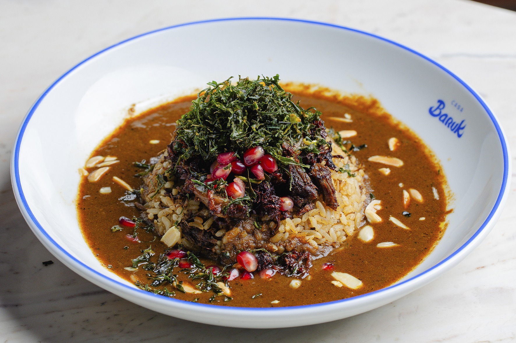 A Casa Baruk apresenta culinária árabe e mediterrânea reinterpretada com técnicas contemporâneas. A folha de kibe cru surge em lâmina delicada, acompanhada de picles artesanal, cebola, hortelã, romã e azeite extravirgem, destacando frescor e acidez. O arroz de cordeiro é cozido no próprio caldo da carne e servido com pernil assado lentamente, sementes de romã, lâminas de amêndoas e crisp de couve. Já o Shish Barak traz massas recheadas de carne, assadas e finalizadas em molho de iogurte com manteiga de salsinha e amêndoas torradas, equilibrando cremosidade e sabor intenso.