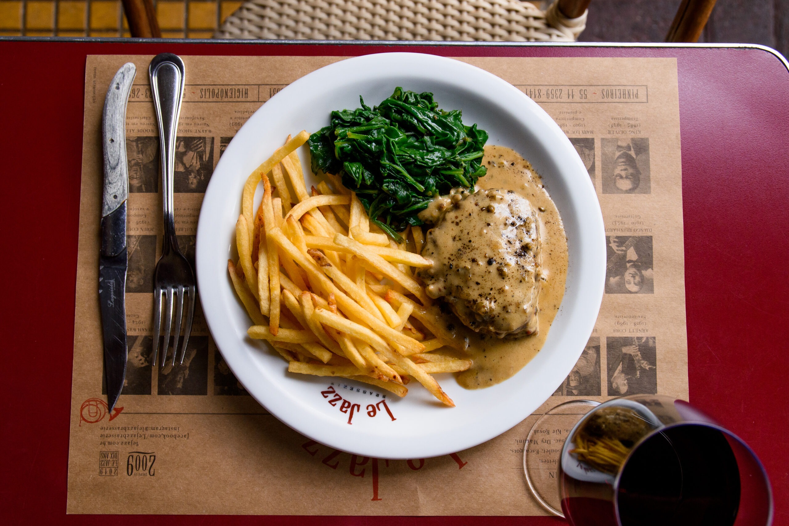 O Le Jazz Brasserie é um clássico paulistano dedicado à cozinha francesa trivial, conhecido por seus pratos tradicionais e atmosfera boêmia. Entre os destaques está o Filet au Poivre, corte de cerca de 220g grelhado, servido com espinafre refogado, molho intenso de pimenta-do-reino e acompanhamento de fritas ou purê. O Pâté de Foie de Volaille traz patê de fígado de frango equilibrado pela redução de balsâmico, nozes-pecãs agridoces, ciboulette e torradas. Para finalizar, a Tarte Fine aux Pommes aparece como sobremesa clássica: torta de maçã servida quente com sorvete caseiro de baunilha.
