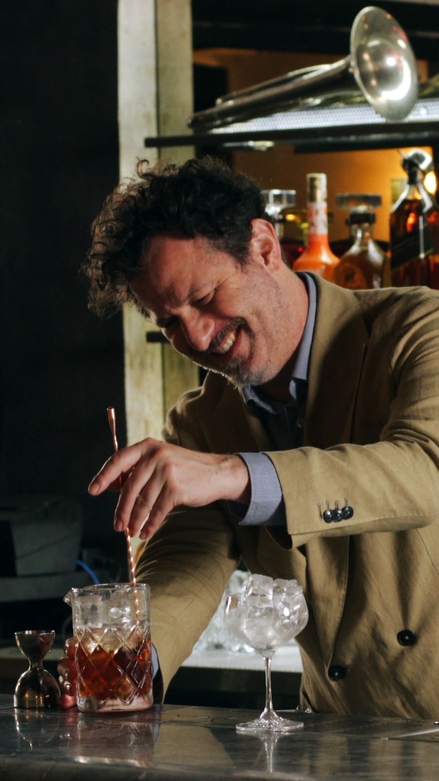 É atrás do balcão de mármore, ladeado por seis bancos de couro, que Lívio Poppovic — parceiro de D’Agostino nos tempos do Apothek — assume as coqueteleiras. A presença dele não é detalhe, mas parte da espinha dorsal da casa. “Não existia a menor chance de ser outra pessoa”, diz Alê.