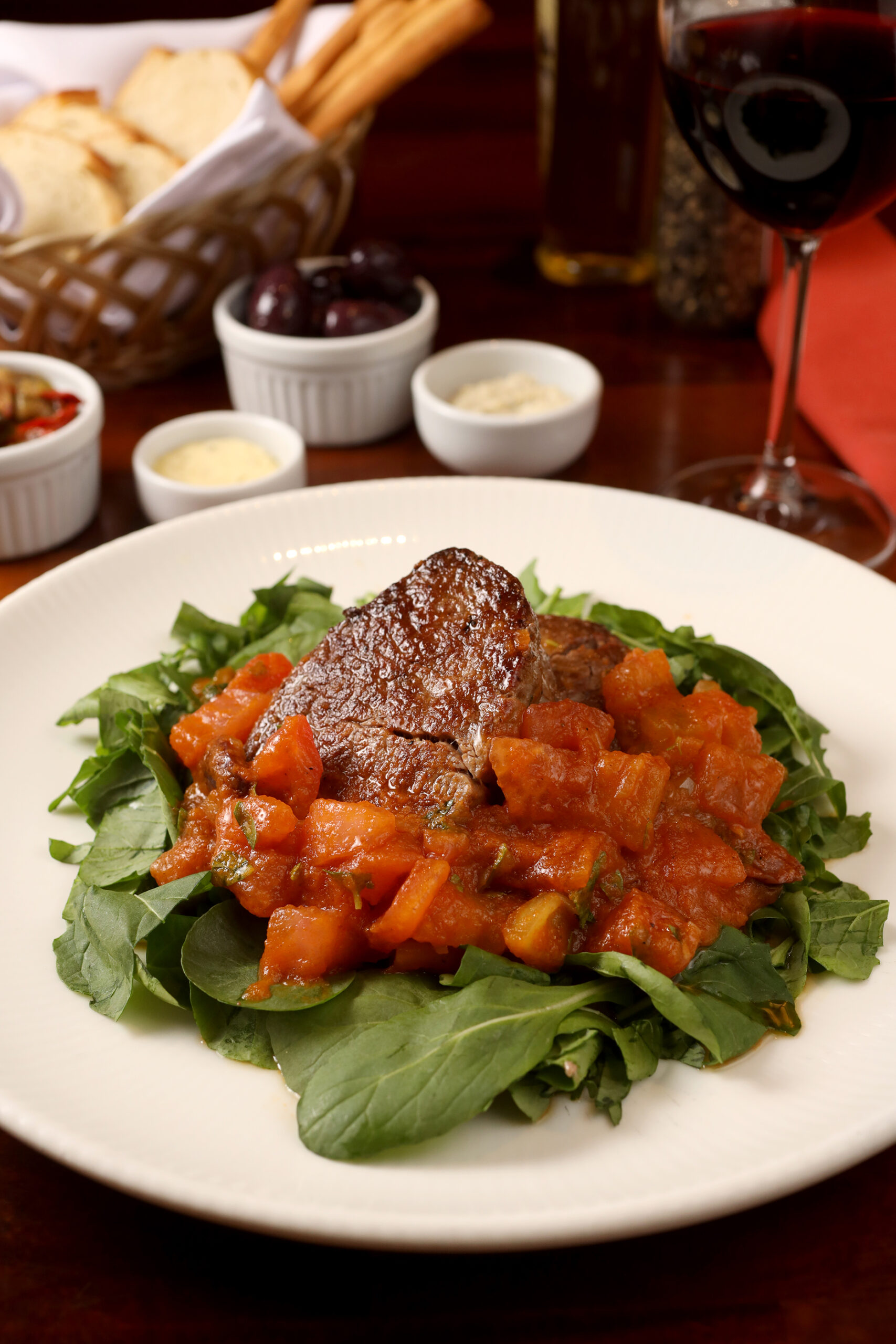 Dentre os pratos principais, estão o Anolini di Agnelo, massa artesanal recheada de cordeiro, um toque de molho branco, aspargos verdes, tomate cereja e manjericão; e o Medalhão de filé grelhado com molho de tomate sem pele, manjericão e azeitonas pretas. Acompanha rúcula triturada.