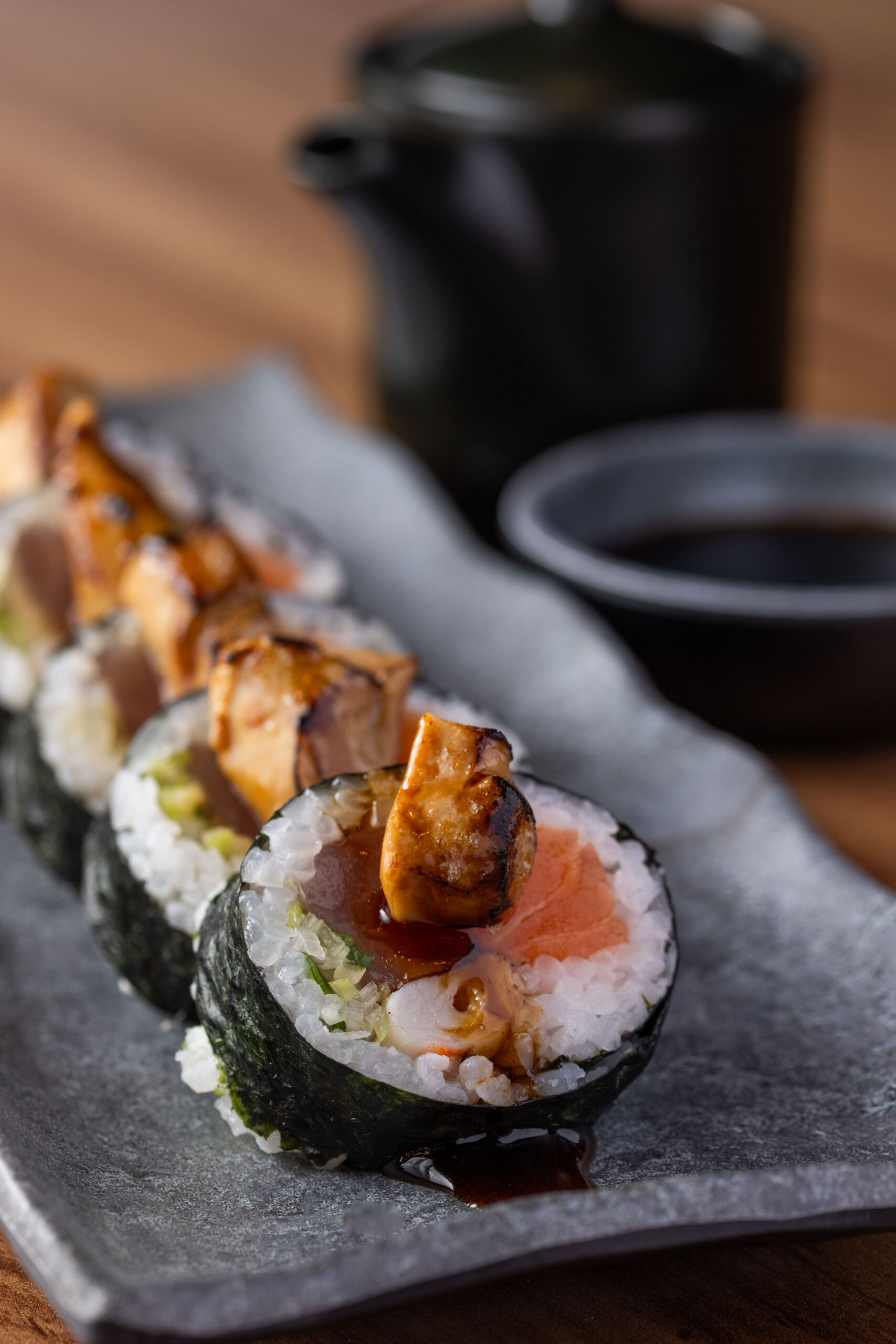 O tradicional Okonomiyaki aparece em versão contemporânea, com frutos do mar e molho tonkatsu, e o Hot Roll Royal mistura camarão, barriga de salmão, cream cheese, ovas, cebolinha e emulsão de trufa branca — uma combinação que brinca com influências italianas e japonesas.