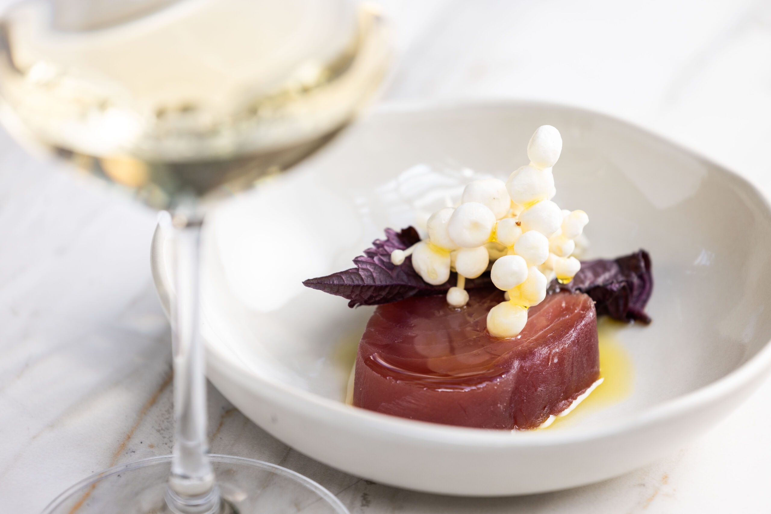 A experiência começa com dois amuse-bouches que revelam a leveza da chef: shot de tomate italiano com azeite extravirgem e flor de sal e atum curado com enoki cru e shissô.