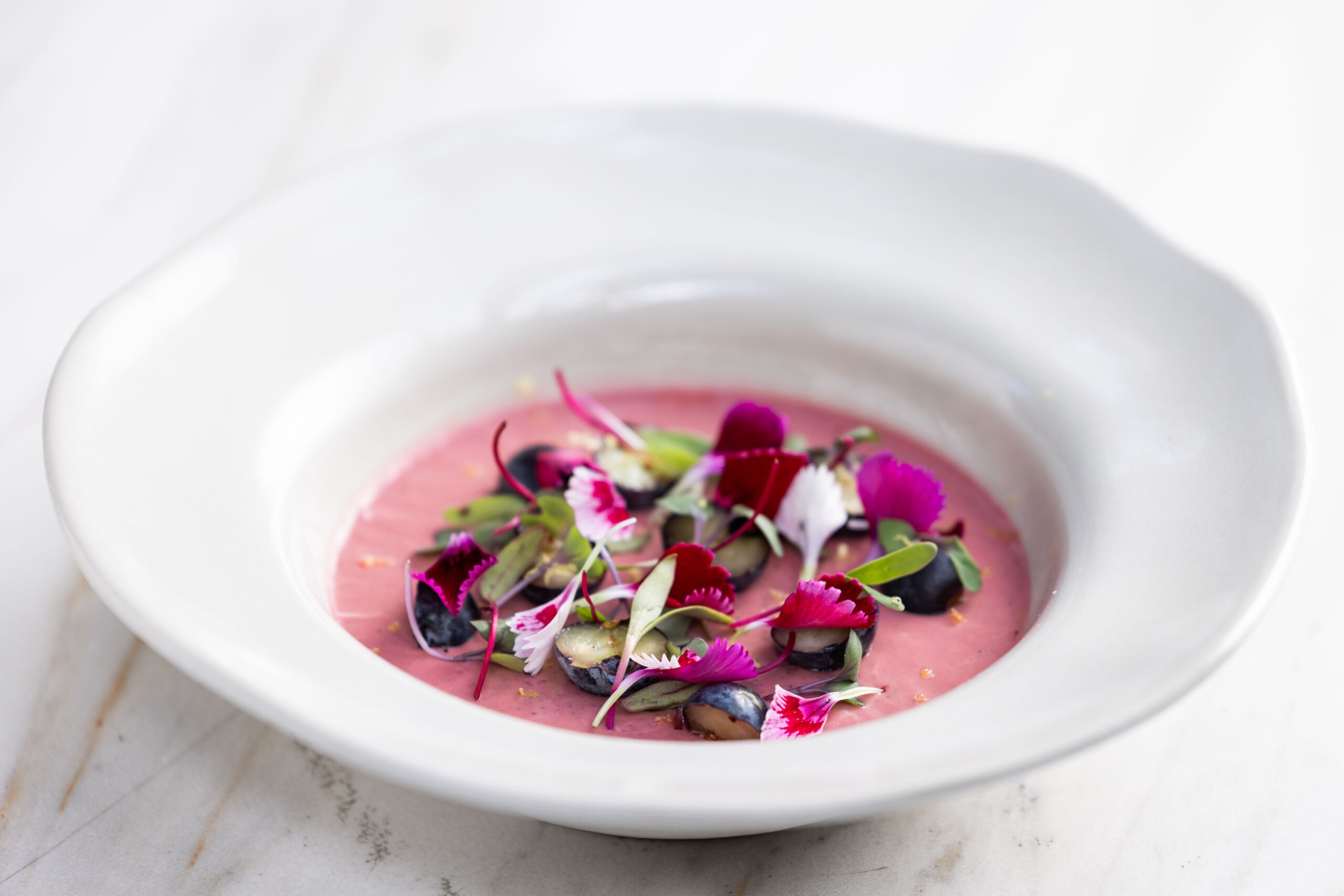A sobremesa encerra o jantar com frescor e delicadeza: pannacotta de redução de beterraba com mirtilo, limão siciliano e mel de jataí.