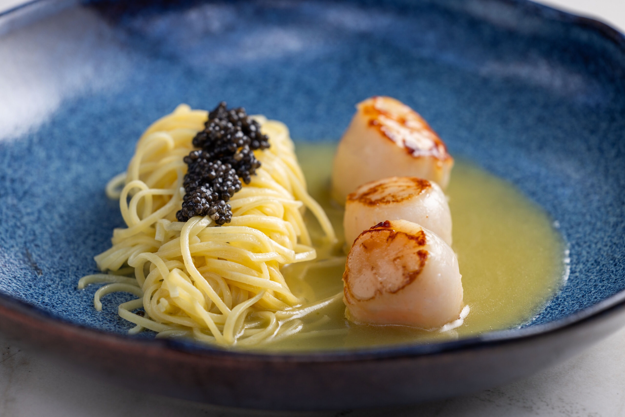 Na sequência, o menu apresenta pratos que exploram contrastes de textura e profundidade de sabor. A primeira etapa traz abóbora assada na manteiga acompanhada de roti de cogumelos e eryngui selado, seguida por tagliolini com beurre blanc, servido com vieiras, caviar siberian e limão siciliano.