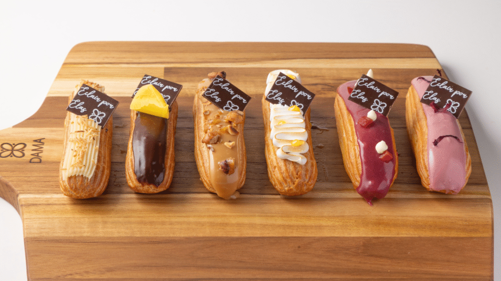 Para celebrar os 14 anos da Confeitaria Dama, as sócias e cunhadas Daniela e Mariana Gorski lançaram a ação Éclair Por Elas, em que um time de cinco celebradas mulheres da Gastronomia assina receitas de recheios de éclair, clássico da pâtisserie francesa feito com a massa choux da casa. As criações de Carla Pernambuco, Carole Crema, Roberta Sudbrack, Tássia Magalhães e Telma Shimizu estarão disponíveis até o dia 16 de novembro.