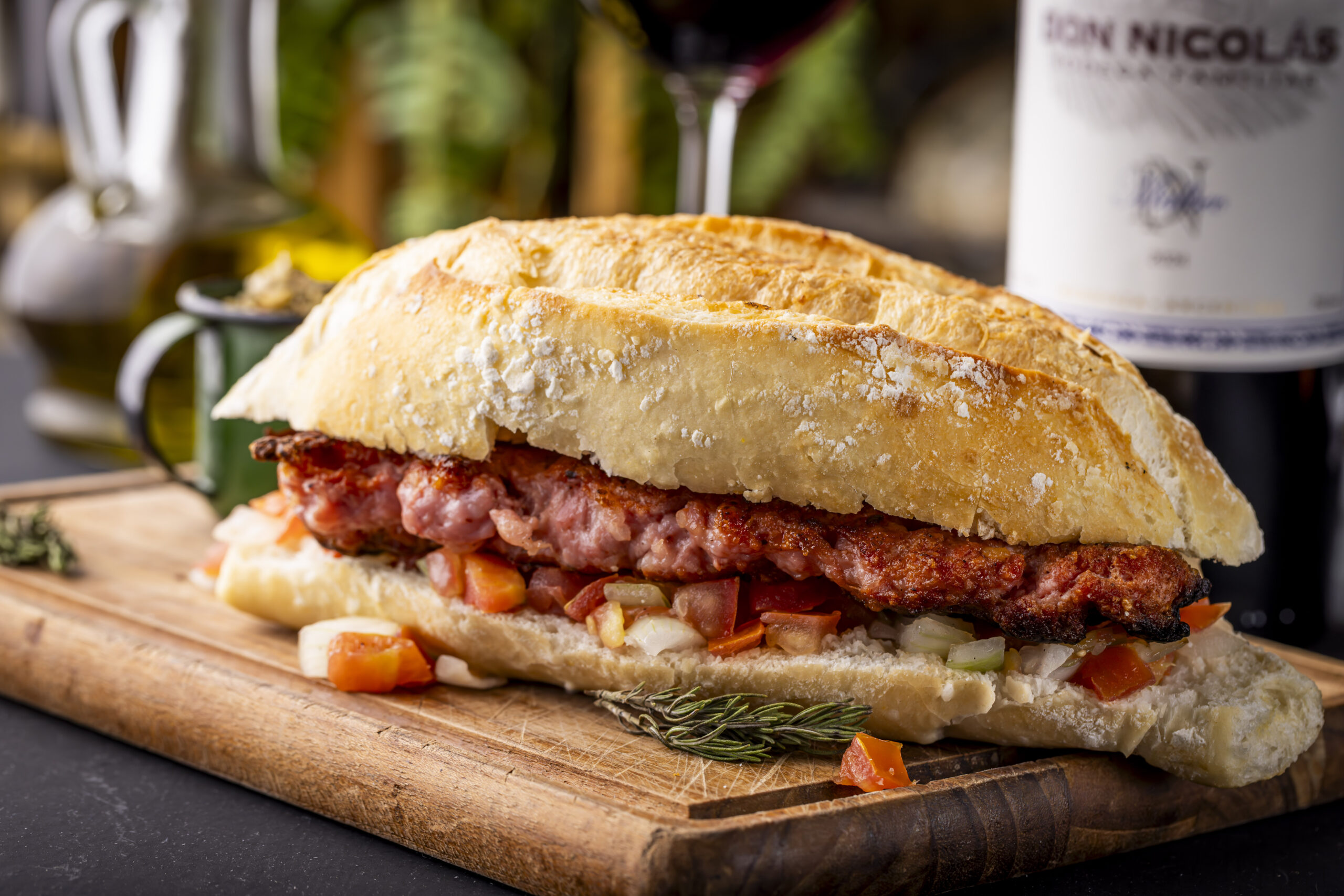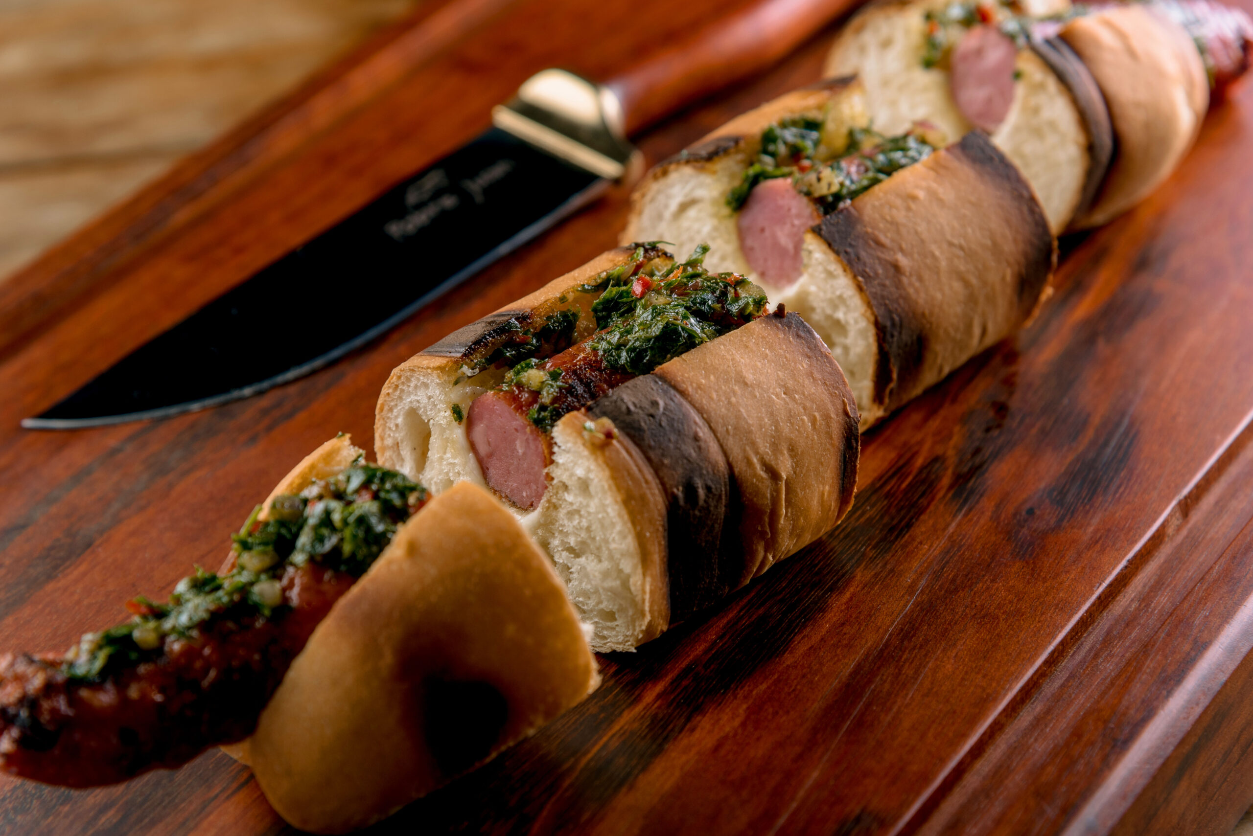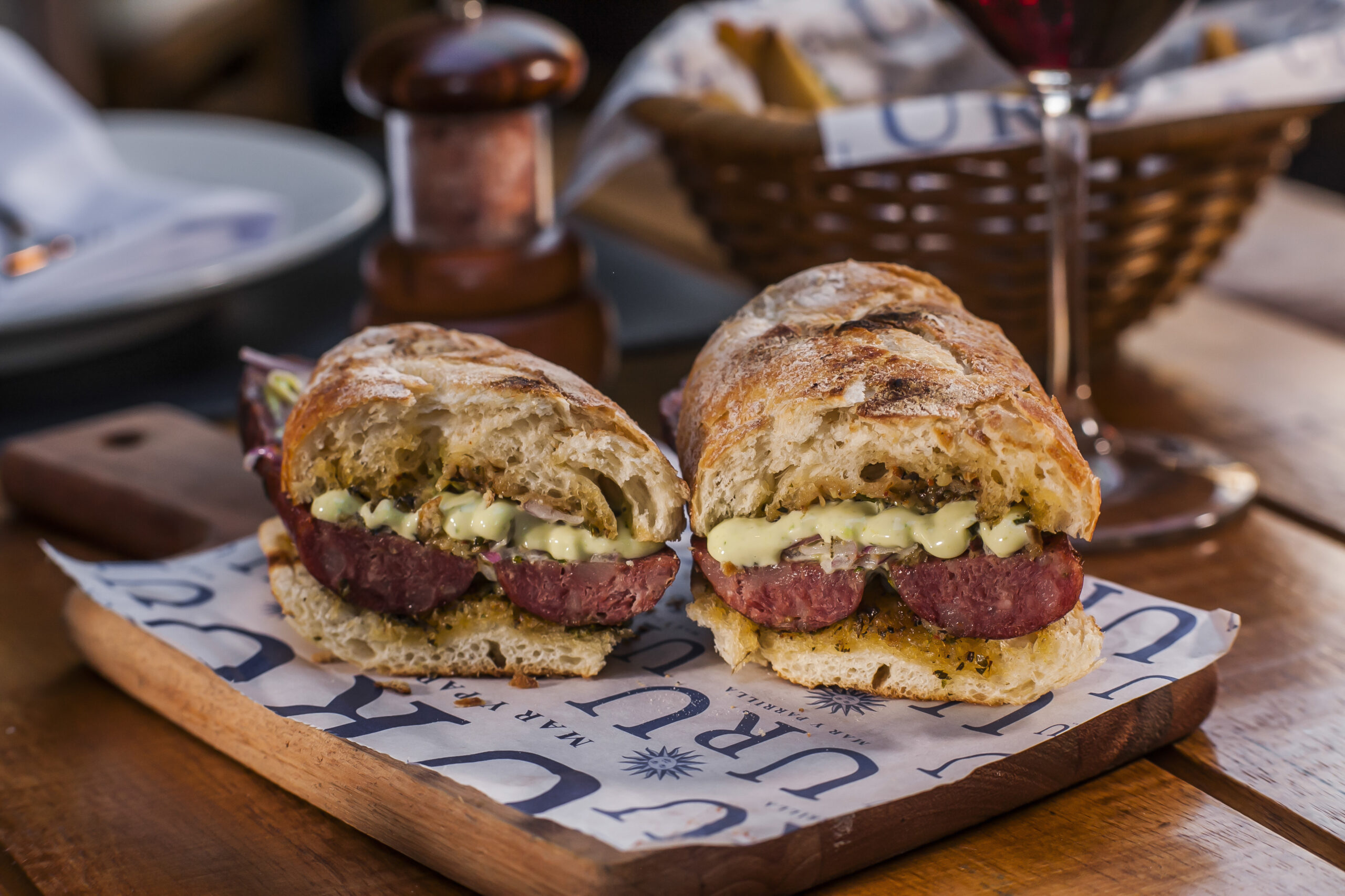 No Uru Mar Y Parrilla é possível desfrutar o tradicional sanduíche uruguaiano Choripán. Seguindo a receita original do país latino, o lanche leva chorizo parrillero, maionese da casa e salsa criolla.