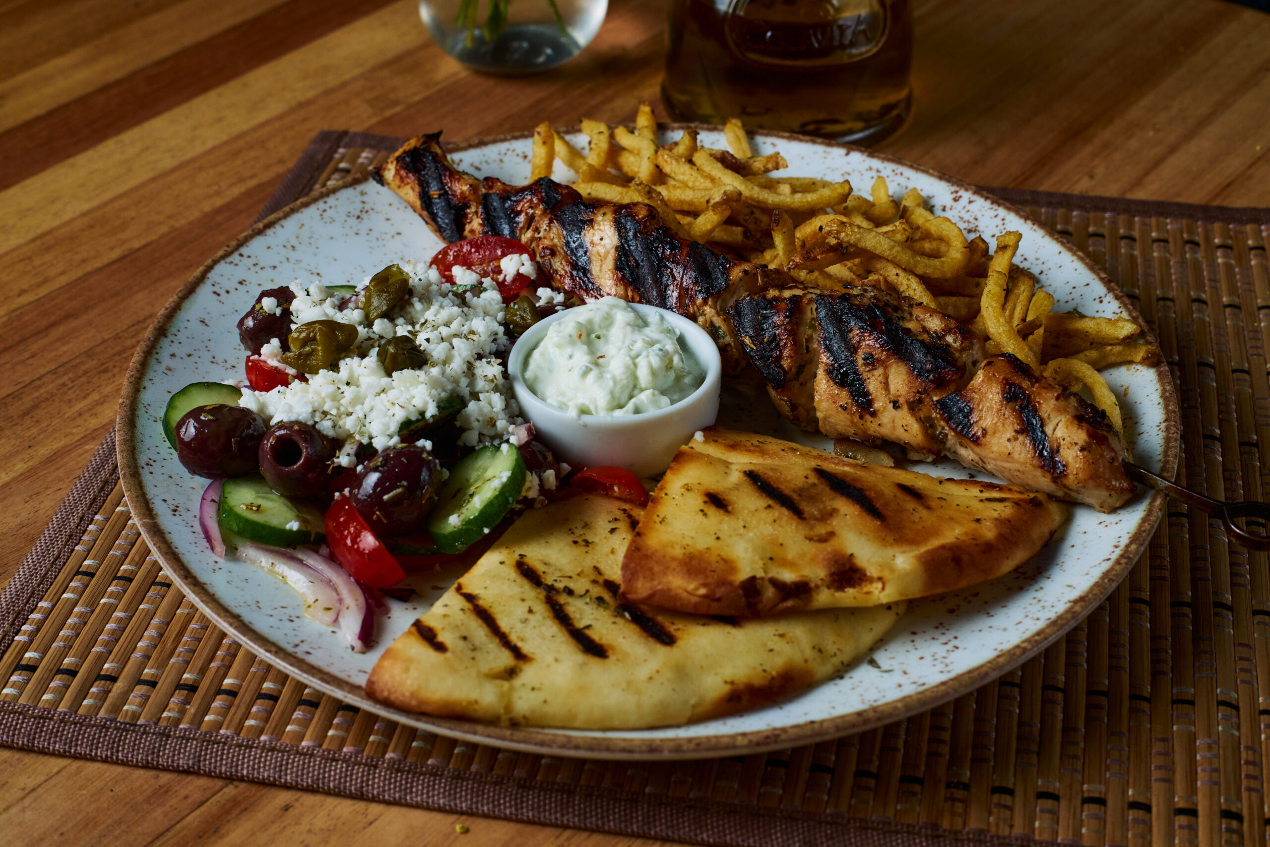 Nos principais, destaque para a Koto Souvlaki, espetada de frango à moda grega acompanhada de tzatziki, salada e pão pita, além da Spaghtetti Manitária, com cogumelos salteados ao vinho e salsa trufada. Outra aposta criativa é a Yemistá Kalamari – lula grelhada recheada com couscous marroquino e camarão, servida com molho rústico de tomates e espinafre.