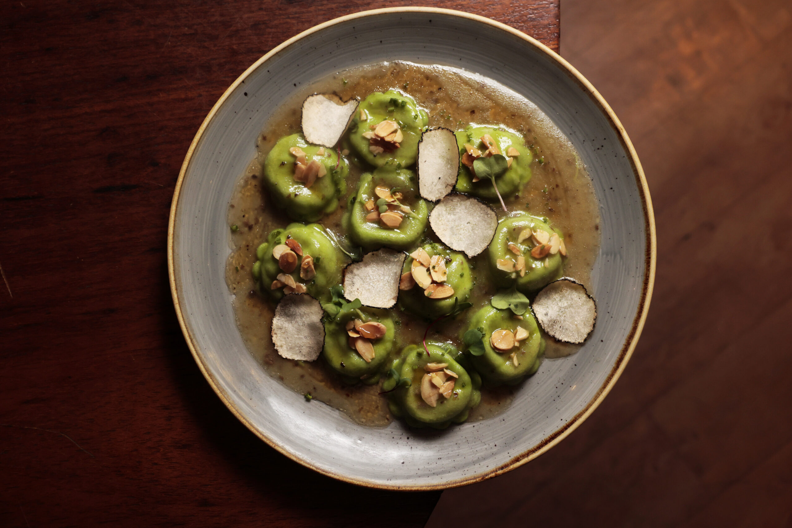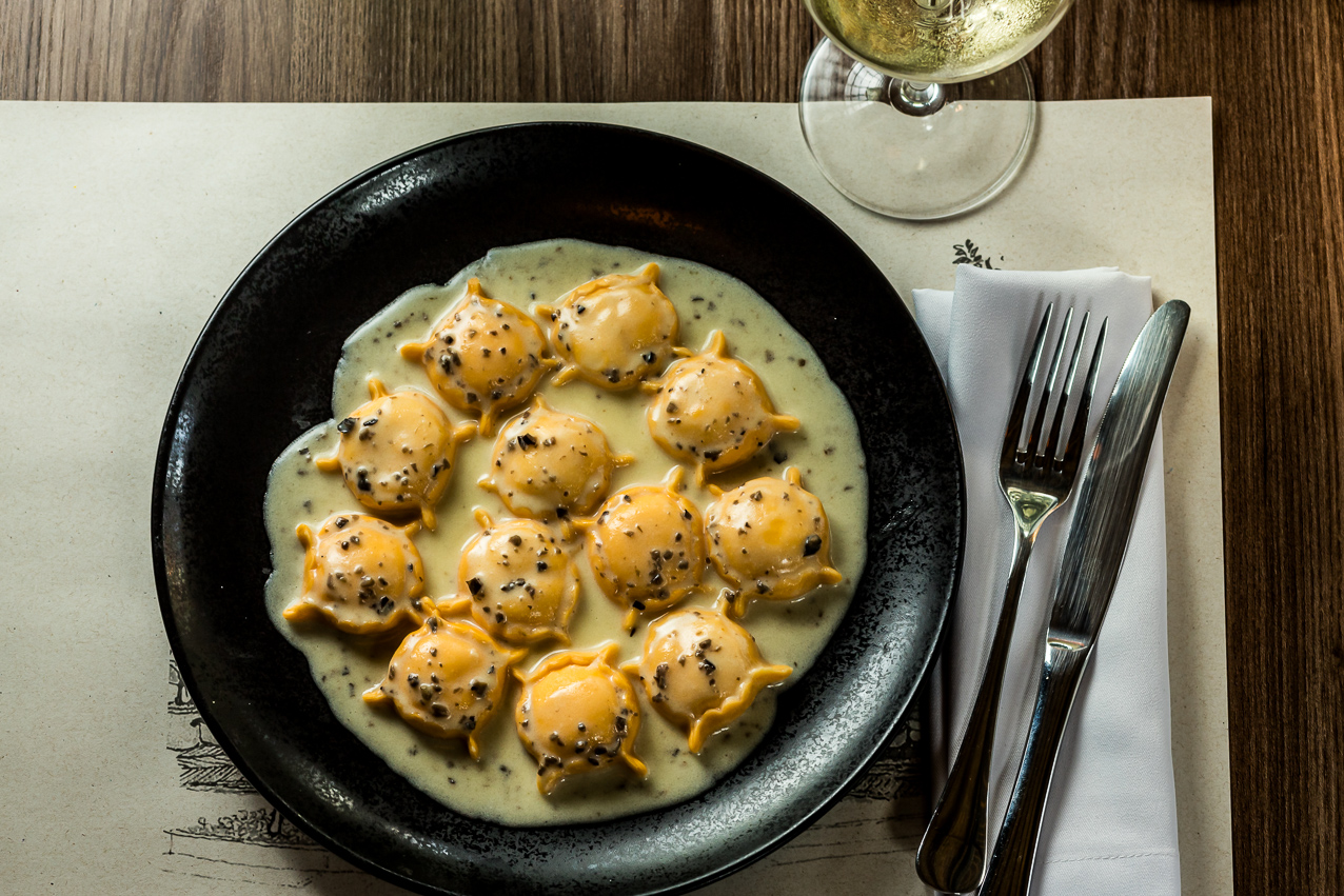 Referência nacional em alta gastronomia italiana com trufas a preços acessíveis, a Tartuferia San Paolo oferece um prato vegetariano digno de celebração: o Ravioli di Boursin. A massa recheada com espinafre e queijo de cabra é servida com manteiga dourada, amêndoas laminadas e um delicado fio de mel de trufas. O cliente ainda pode finalizar o prato com trufas frescas Estivo laminadas, elevando a experiência com um toque terroso e perfumado. Uma receita que une técnica, textura e aroma com equilíbrio perfeito.