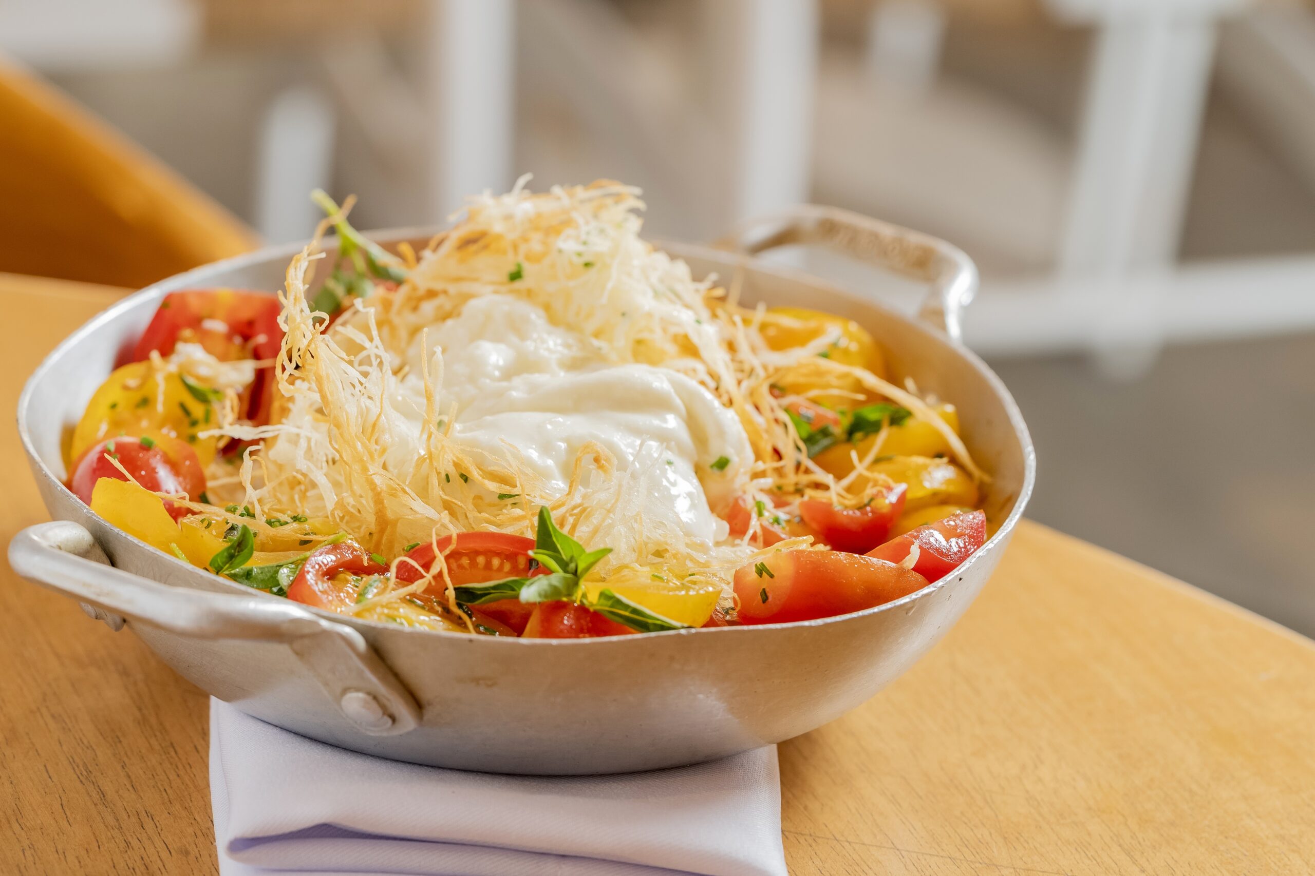 Inspirado na culinária mediterrânea, o Myk aposta na valorização dos vegetais em pratos sofisticados. A Terrine de Tomate vem acompanhada de uma refrescante sopa fria de melancia e tomate, contrastando com o queijo feta salgado. A Burrata Assada chega à mesa envolta em kataifi (massa finíssima do tipo “cabelo de anjo”), servida com tomates e manjericão fresco. Já a Couve-Flor Assada é acompanhada de um purê de favas e crocante de grão-de-bico com pesto de ervas.