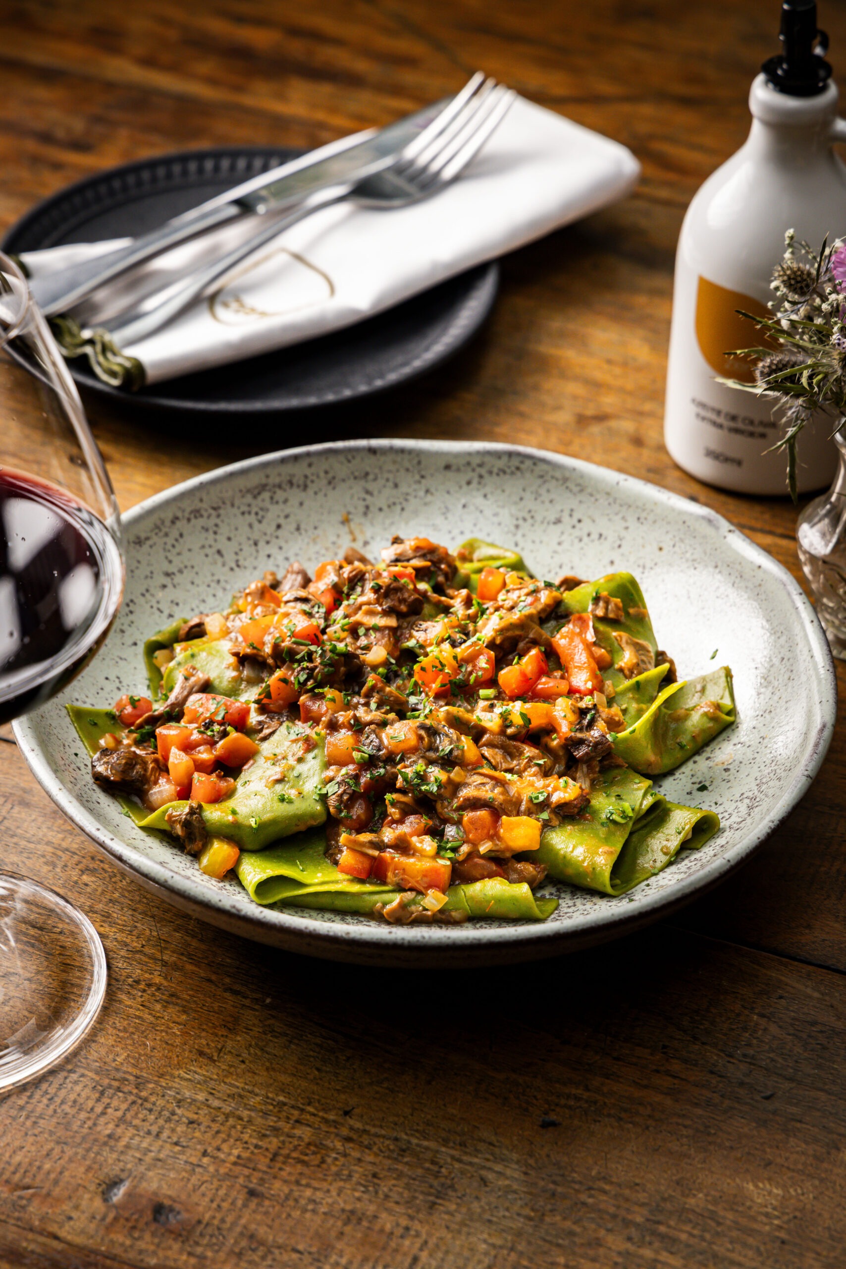 Nos pratos principais, duas opções emblemáticas traduzem o espírito da Ligúria: o Mandilli al tocco di funzi, massa típica em formato de lenço servida com ragu de funghi secchi e tomates, ou o Coniglio alla Ligure, clássico da casa preparado com coelho assado ao vinho tinto, azeitonas e cebolas borettane ao aceto balsâmico de Modena IGP, acompanhado de gnocchi de batatas.