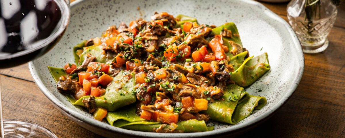 Nos pratos principais, duas opções emblemáticas traduzem o espírito da Ligúria: o Mandilli al tocco di funzi, massa típica em formato de lenço servida com ragu de funghi secchi e tomates, ou o Coniglio alla Ligure, clássico da casa preparado com coelho assado ao vinho tinto, azeitonas e cebolas borettane ao aceto balsâmico de Modena IGP, acompanhado de gnocchi de batatas.
